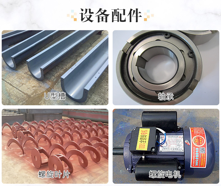 水泥螺旋輸送機其主要的配件由:螺旋葉片,電機,軸承,螺旋槽等其螺旋葉片和電機的價格比列是比較高的,螺旋葉片的材質有三種碳鋼,錳鋼,不銹鋼三種錳鋼是耐磨的一種所以價格各上會比較貴一點。