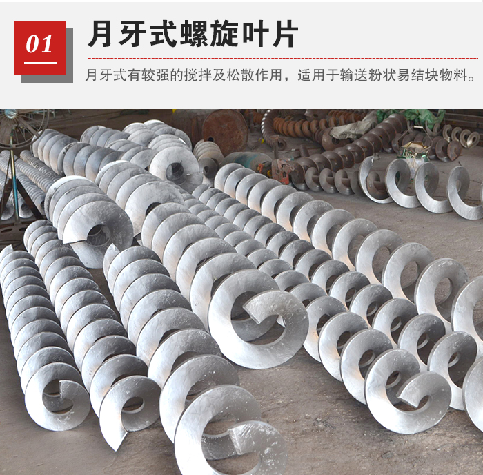 月牙式有較強(qiáng)的攪拌及松散作用,適用于輸送粉狀易結(jié)塊物料。