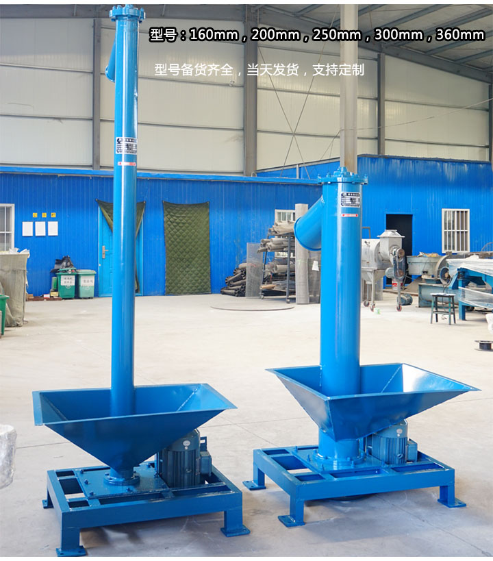 大漢機械的垂直立式螺旋輸送機型號有160,200,250,300,360等5種規格,且備貨齊全,支持當天發貨;此外,特定型號可根據用戶描述需求,設計圖紙,進行生產,如移動式垂直立式螺旋輸送機,專用于不固定場所的物料輸送。