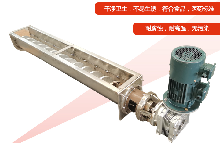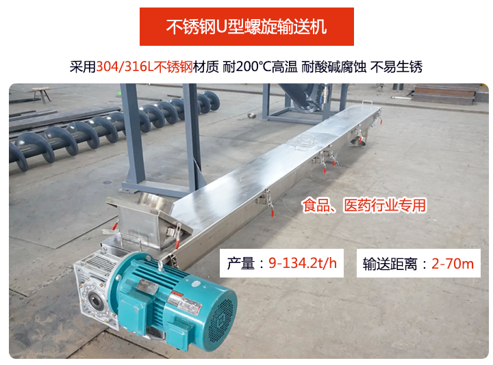 不銹鋼U型螺旋輸送機(jī)由于采用了304或316不銹鋼材質(zhì),耐磨、耐腐蝕效果非常好,耐高溫:可達(dá)200℃可以輸送200℃粉末、顆粒及小塊狀物料,不易生銹及不易污染物料:04或316不銹鋼材質(zhì)拋光處理,干凈衛(wèi)生,不會(huì)生銹,并且設(shè)備密封性好,可以避免對(duì)輸送物料及環(huán)境造成污染,所以一般在食品、醫(yī)藥等衛(wèi)生要求較為嚴(yán)格的行業(yè)中應(yīng)用較為廣泛,此外,還可用戶普通化工行業(yè),可抵抗弱酸、弱堿性物料的侵蝕。